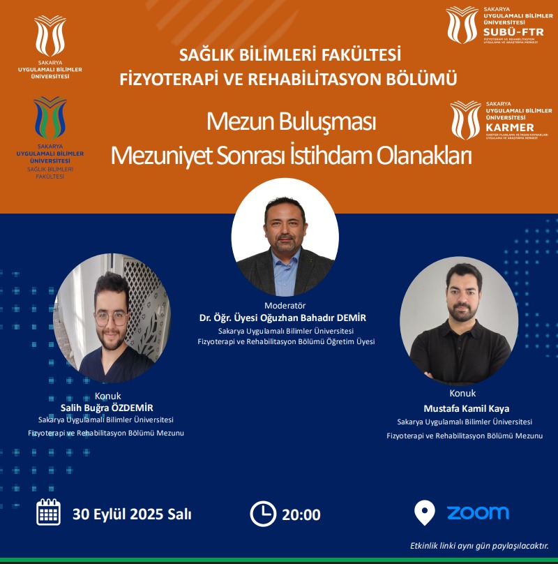 Sakarya Uygulamalı Bilimler Üniversitesi Sağlık Bilimleri Fakültesi Fizyoterapi ve Rehabilitasyon Bölümü tarafından düzenlenen “Mezun Buluşması: Mezuniyet Sonrası İstihdam Olanakları” etkinliği, 30 Eylül 2025 Salı günü saat 20.00’de Zoom platformunda gerçekleştirilecektir. Etkinlikte moderatörlüğü Dr. Öğr. Üyesi Oğuzhan Bahadır Demir üstlenirken, bölüm mezunları Salih Buğra Özdemir ve Mustafa Kamil Kaya deneyimlerini paylaşacaktır.