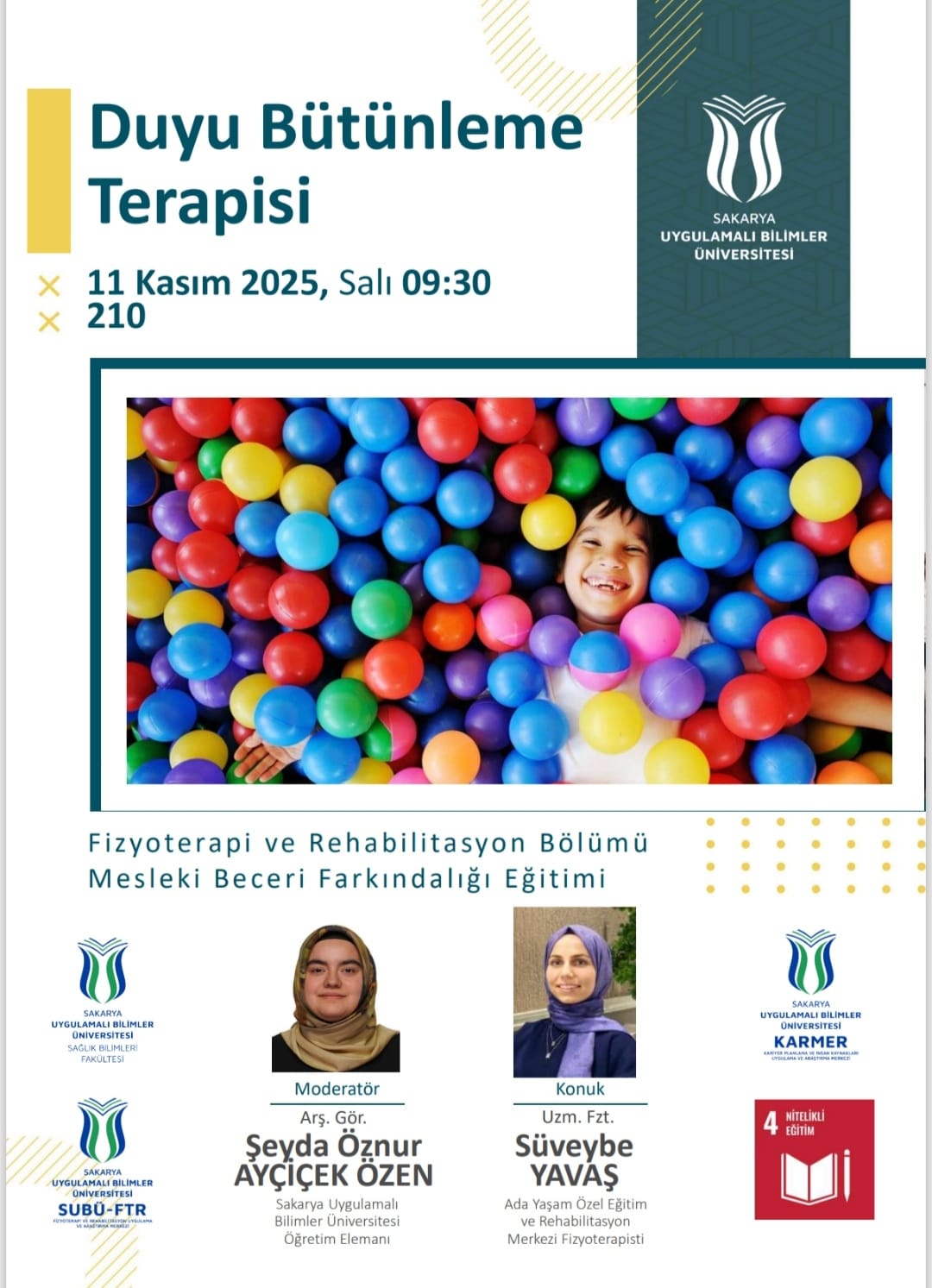 Fakültemiz Fizyoterapi ve Rehabilitasyon Bölümü, Arş. Gör. Şeyda Öznur Ayçiçek moderatörlüğünde, Uzman Fizyoterapist Süveybe Yavaş tarafından “Duyu Bütünleme Terapisi” konulu söyleşi gerçekleştirilecektir. Etkinliğe tüm öğrencilerimiz davetlidir. Galeri