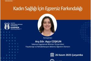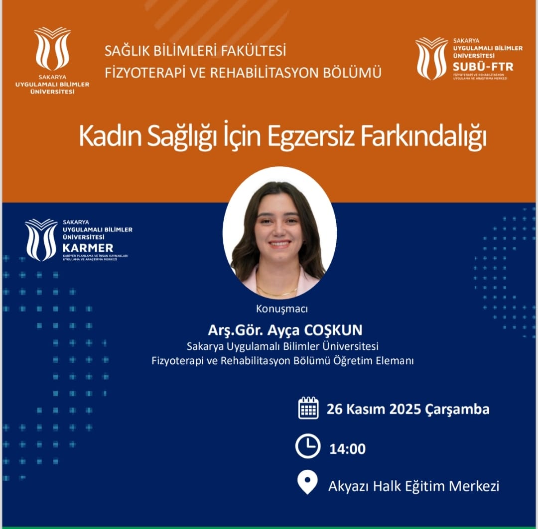 Fakültemiz Fizyoterapi ve Rehabilitasyon Bölümü öğretim elemanı Arş. Gör. Ayça Coşkun tarafından düzenlenen “Kadın Sağlığı İçin Egzersiz Farkındalığı” etkinliği, 26 Kasım 2025 Çarşamba günü saat 14.00’te Akyazı Halk Eğitim Merkezi’nde gerçekleştirilecektir. Etkinlikte, kadın sağlığında egzersizin önemi, doğru egzersiz alışkanlıkları ve günlük hayata yönelik pratik öneriler ele alınacaktır. Etkinlik tüm katılımcılara açıktır.