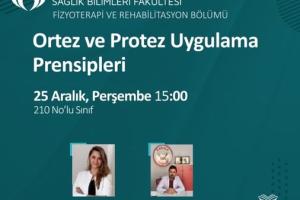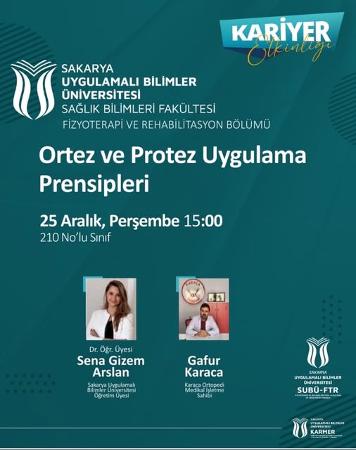 Fakültemiz Fizyoterapi ve Rehabilitasyon Bölümü Öğretim Üyesi Dr. Öğr. Üyesi Sena Gizem Arslan moderatörlüğünde Karaca Ortopedi işletme sahibi Sayın Gafur Karaca nın katılımı ile 25 Aralık Perşembe günü “Ortez ve Protez Uygulama Prensipleri” konulu etkinlik düzenlenecektir. Tüm öğrencilerimiz davetlidir.