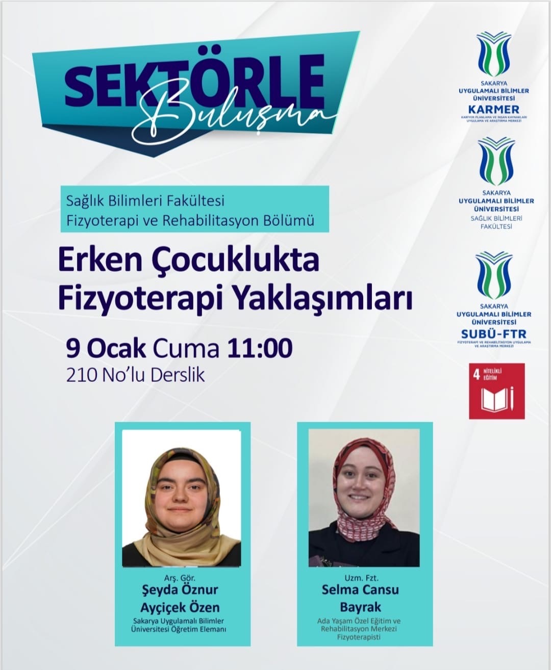 Fakültemiz Fizyoterapi ve Rehabilitasyon Bölümü Arş. Gör. Şeyda Öznur Ayçiçek Özen moderatörlüğünde, Uzman Fizyoterapist Selma Cansu Bayrak tarafından “Erken Çocuklukta Fizyoterapi Yaklaşımları” konusu kapsamında Sektörle Buluşma etkinliği düzenlenecektir. Etkinliğe tüm öğrencilerimiz davetlidir.