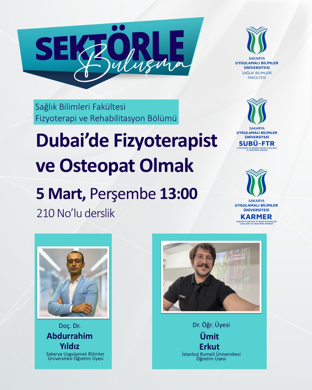 Fizyoterapi ve Rehabilitasyon bölümünün sektörle buluşma etkinliği kapsamında “Dubai’de Fizyoterapist ve Osteopat Olmak” konulu etkinlik Fizyoterapi ve Rehabilitasyon Bölüm Başkanı Doç. Dr. Abdurrahim Yıldız moderatörlüğünde Dr. Öğr. Üyesi Ümit Erkut’un katılımıyla 5 Mart Perşembe günü 13.00’da gerçekleştirilecektir. Tüm öğrencilerimiz davetlidir.