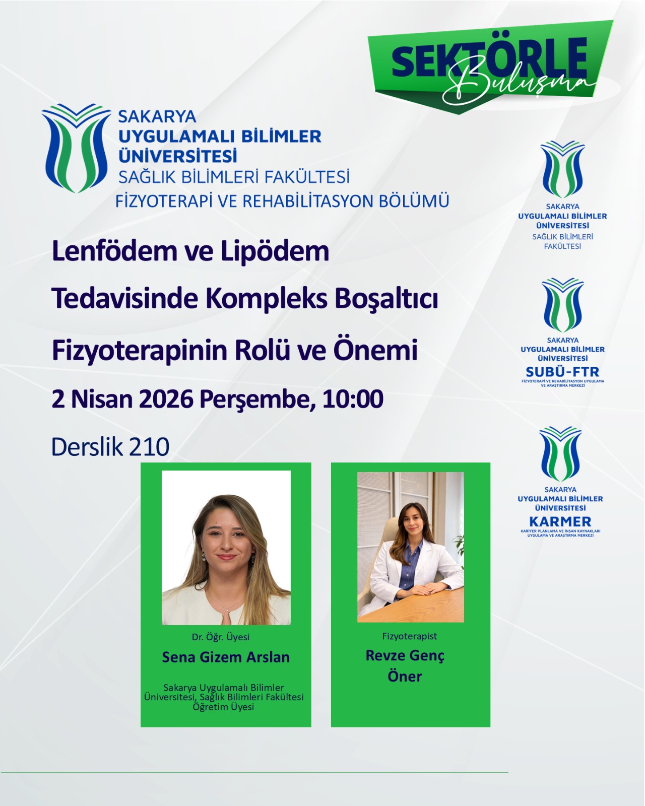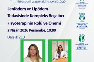 Fakültemiz Fizyoterapi ve Rehabilitasyon Bölümü Sektörle Buluşma Etkinliği kapsamında “Lenfödem ve Lipödem Tedavisinde Kompleks Boşaltıcı Fizyoterapinin Rolü ve Önemi” başlıklı konu ile 2 Nisan Perşembe günü etkinlik gerçekleştirilecektir. Konuğumuz Fzt Revze Genç Öner, Dr. Öğr. Üyesi Sena Gizem Arslan moderatörlüğünde klinik bilgi deneyimini öğrencilere aktaracaktır.